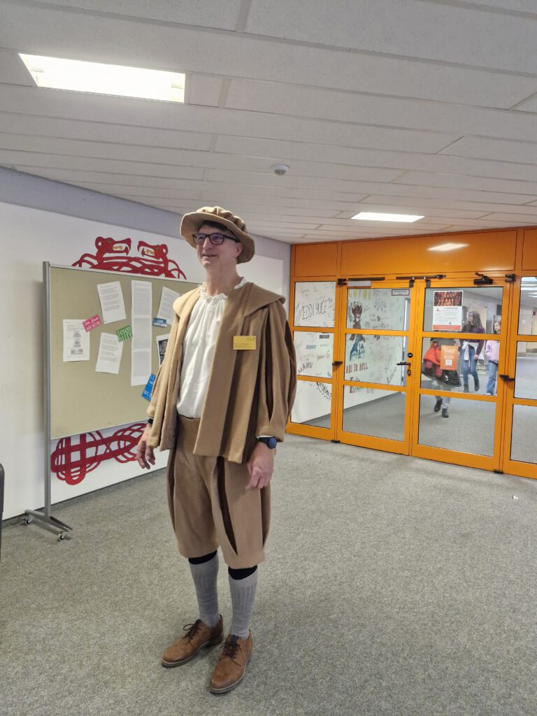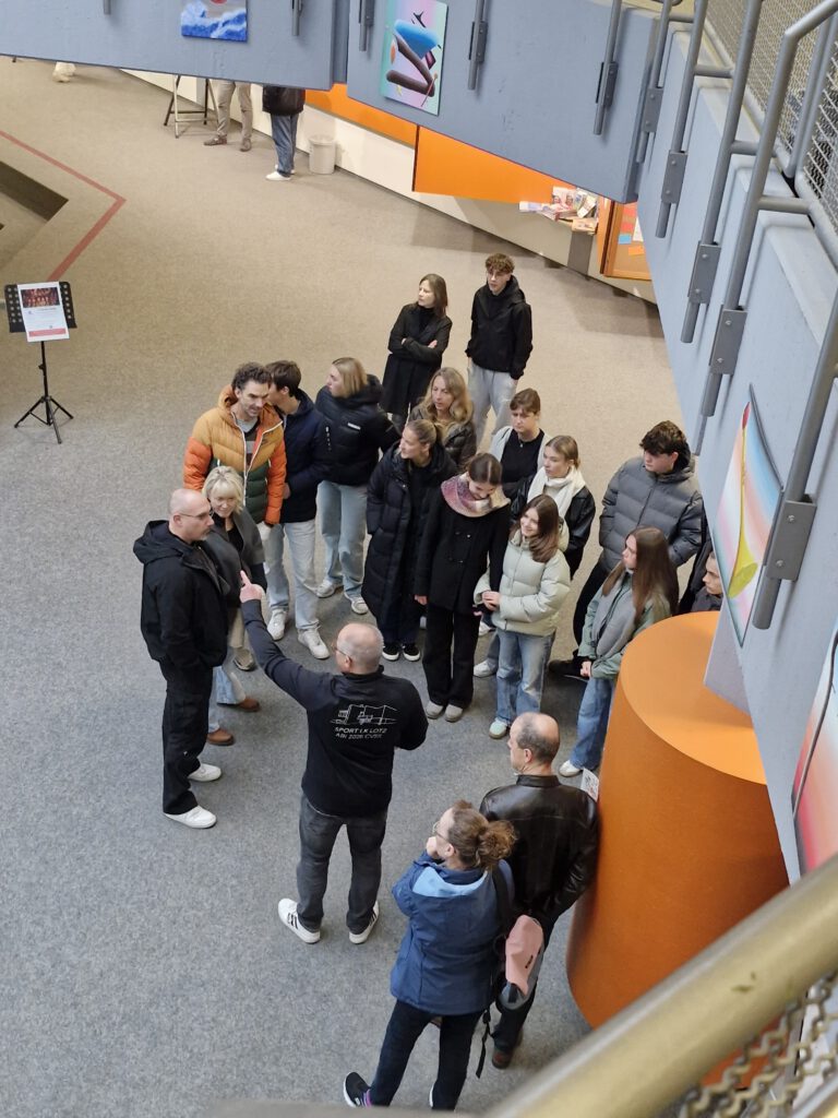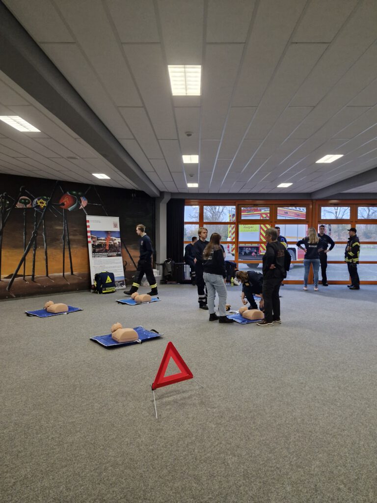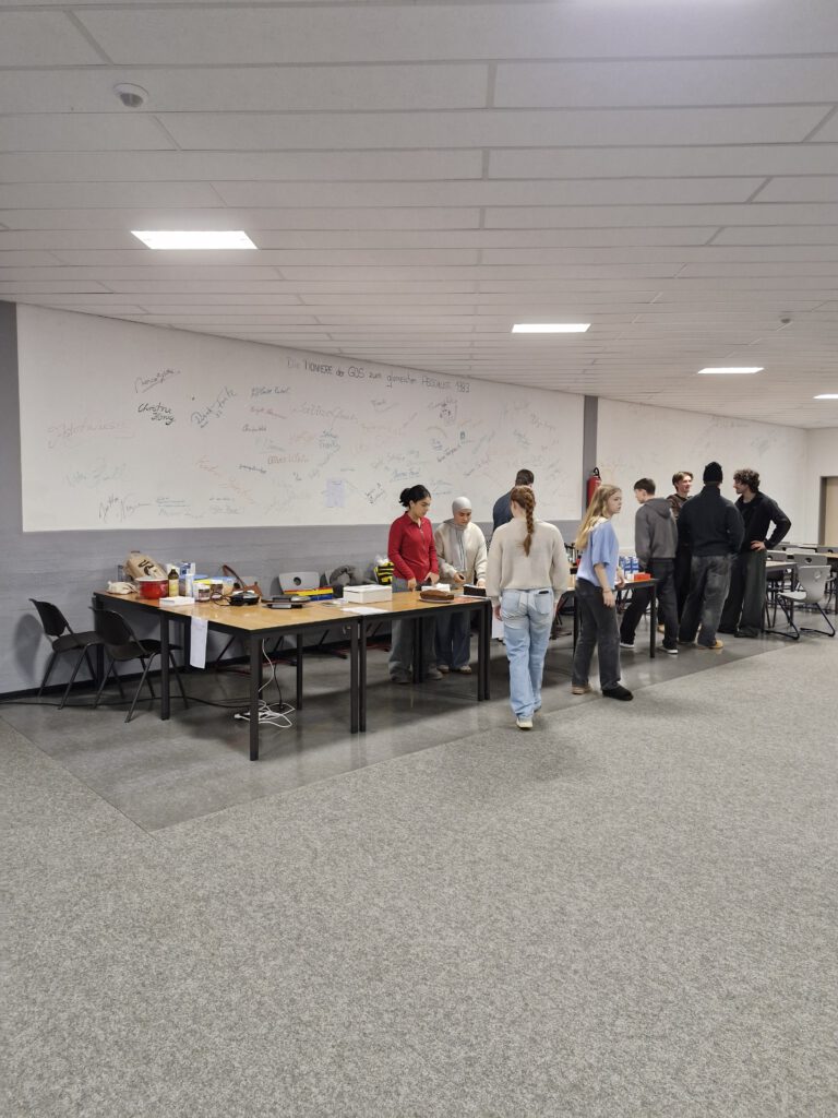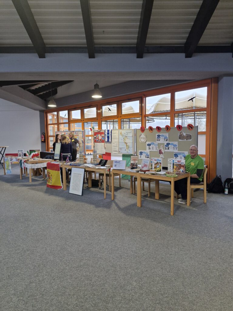 Am Samstag, den 08. November 2025, fand an unserer Schule der Tag der Offenen Tür in der Zeit zwischen 10 und 13 Uhr statt. In diversen Räumen und im Schulhaus verteilt konnten interessierte SchülerInnen, Eltern und jeder Interessierte sich über die Schule und die verschiedenen Fächer sowie AGs in der Schule informieren. Im ersten Stock begeisterten die Fremdsprachen und Deutsch mit diversen Infoständen, an denen man sich mit Snacks stärken konnte und zum Beispiel Asterix auf Latein genießen durfte. Direkt daneben hatten die Fächer Kunst und Darstellendes Spiel eine Ausstellung mit Requisiten und Kunstwerken von SchülerInnen vorbereitet. Auch das Fach Sport konnte mit praktischen Übungen viele begeistern. Im Erdgeschoss war die Rettungssanitäter-AG mit Übungspuppen vertreten. Der aktuelle Abiturjahrgang sorgte währenddessen für das leiblich Wohl und auf einer interaktiven Infotafel direkt am Eingang konnte man sich über das Kurssystem an der Schule informieren. Auch die Artenreich AG war vor Ort und bot Honig am Eingang zum Kauf an.